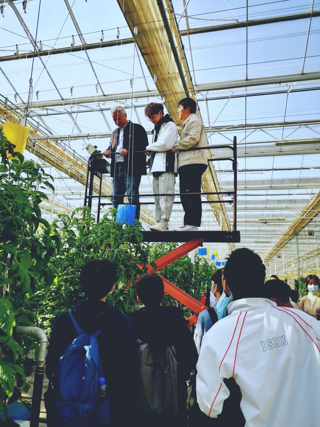 陈锁明带领同学们参观了三栋现代化玻璃温室,讲解了无土栽培的技术要点、温室建筑与结构、设施环境调控技术、设施农业装备原理与操作等,并亲自登车示范了设施作物的日常管理。在全智能温室中控车间,韩勇给同学们详细讲解了园区温度、光、肥、气、热一体化智能控制系统的原理、流程与操作,带领师生参观了智能灌溉系统、净水系统、高压喷雾系统、锅炉加温系统、CO2施肥系统等设施农业装备。